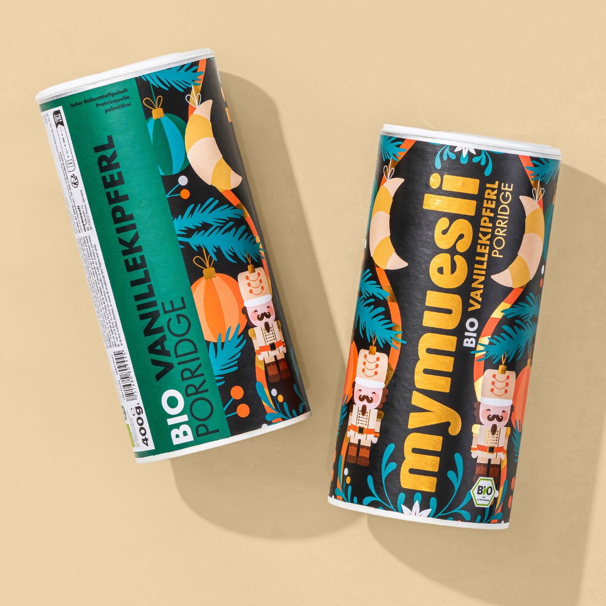 feine Haferflocken (81%), weiße Schokolade (9%) (Rohrohrzucker, Kakaobutter, Vollmilchpulver), Bratapfelkekse mit Gewürzmischung (4%) (Weizenmehl, Rohrohrzucker, Sonnenblumenöl, Weizenstärke, Apfelpulver, gehackte Weinbeeren, Zuckerrohrmelasse, Gewürzmischung (Vollrohrzucker, Kokosblütenzucker, Zimt, Tonkabohne, Vanille, Pfeffer, Orange, Zitrone, Nelke), Meersalz*, Backtriebmittel: Natriumhydrogencarbonat*, natürliches Bourbon-Vanillearoma, Karamellzuckersirup, Antioxidationsmittel: Rosmarinextrakt), Vanillezucker (3%) (Zucker, Vanillepulver), geröstete Mandeln.