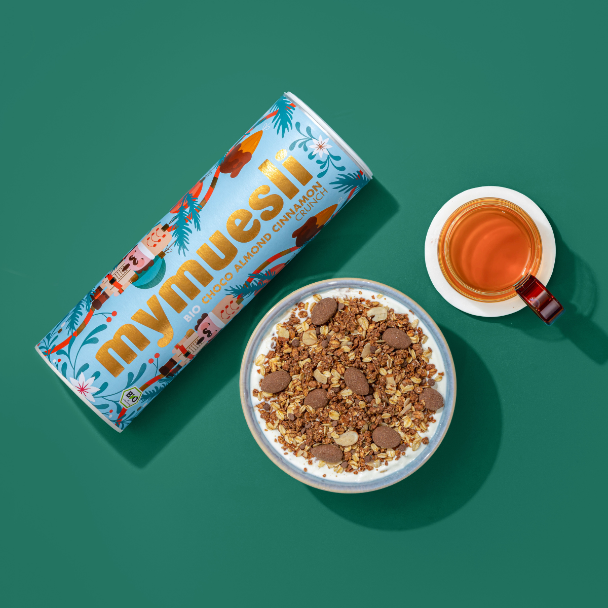 croquants au chocolat (51%) (farine d'avoine complète, sucre de canne brut, huile de tournesol, flocons de blé, farine de riz, pâte de cacao, noix de coco déshydratée, cacao en poudre, sirop de riz, beurre de cacao, farine de malt d’orge, sel de mer*), flocons d'avoine, amandes choco-cannelles (10%) (amandes, sucre de canne brut, beurre de cacao, lait entier en poudre, pâte de cacao, cannelle, clous de girofle, cardamome, macis), chocolat au lait entier (4%) (sucre de canne, beurre de cacao, lait entier en poudre, pâte de cacao), épeautre soufflé enrobé de chocolat noir (sucre de canne, pâte de cacao, beurre de cacao, semoule de maïs, farine complète blé d'épeautre, sirop de riz, sel de mer*), amandes (3%), cannelle (1%).