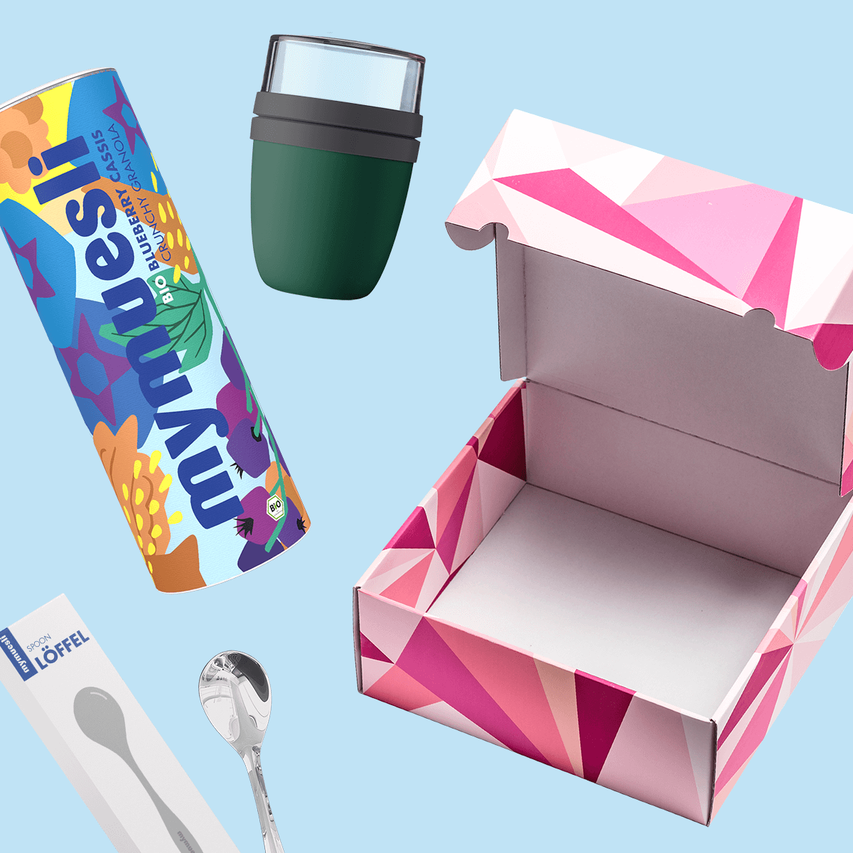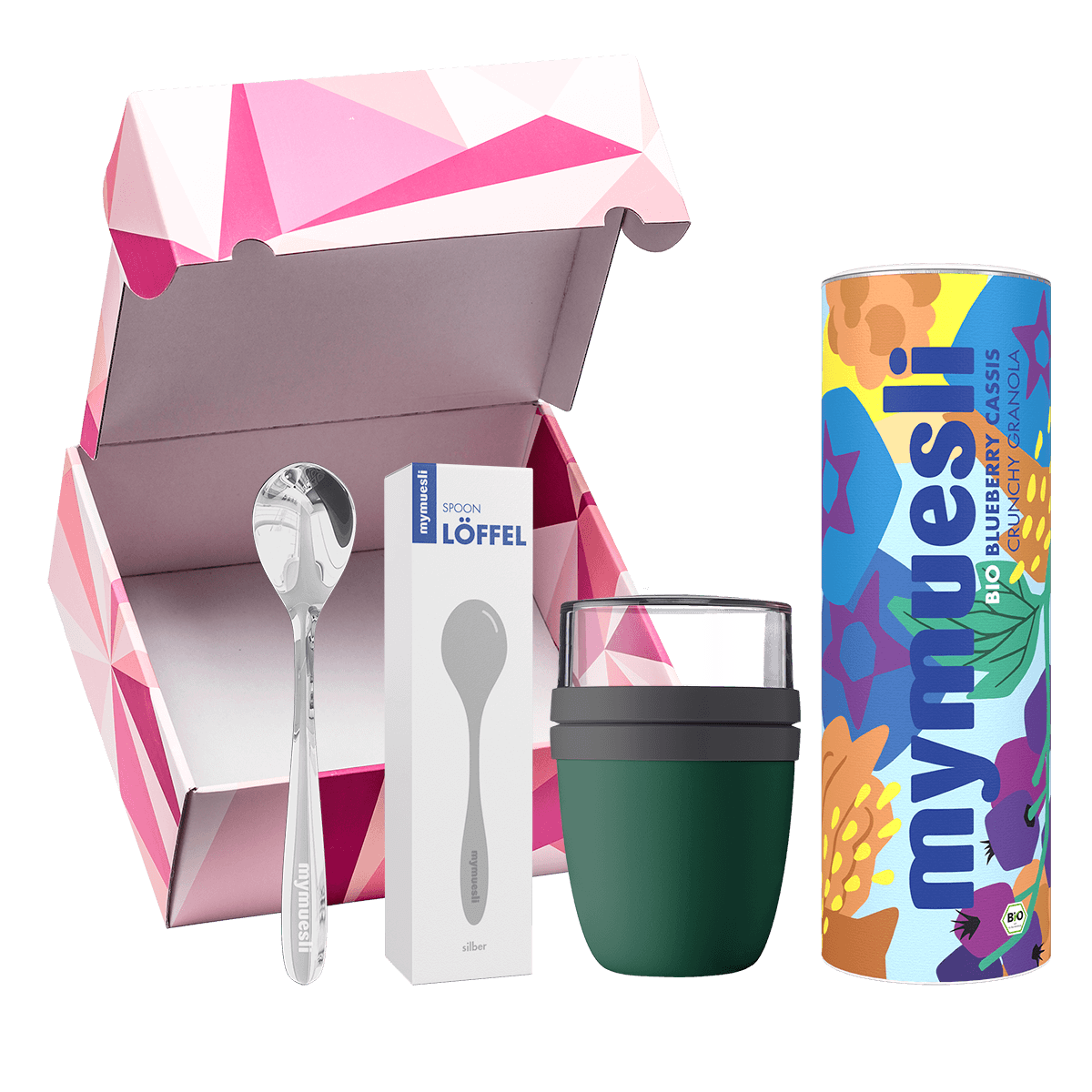 mymuesli Granola Geschenkset mit Bio Blueberry Cassis Crunchy Granola, silbener Löffel und grüner 2Go Becher