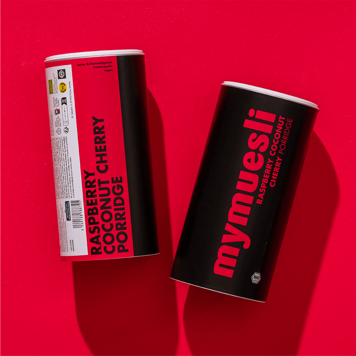 fijne havervlokken (68%), gedroogde zure kersen (10%), amandelen, kokosrasp (5%), gevriesdroogde frambozen (4%), gedroogde cranberry's, suiker, zonnebloemolie.